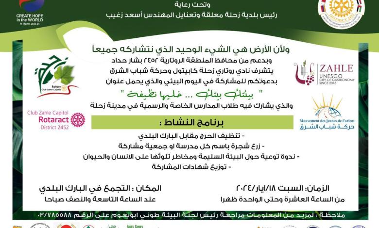 ينظم نادي روتاري زحلة كابيتول وحركة شباب الشرق وتحت رعاية رئيس بلدية زحلة معلقة وتعنايل المهندس اسعد زغيب وبدعم من محافظ المنطقة الروتارية ٢٤٥٢ بشار الحداد ، وبمشاركة من طلاب المدارس الخاصة والرسمية : الثانوية الانجيلية ، المدرسة الارمنية الانجيلية ، الكلية الشرقية الباسلية ، ثانوية القلبين الاقدسين زحلة الراسية ، ثانوية مار يوسف للراهبات الانطونيات زحلة كسارة ، المدرسة الوطنية الاميركية ، مدرسة السلام للاباء الانطونيين ، مدرسة القديسة ريتا ، تكميلية راهبات القلبين الاقدسين ، ثانوية زحلة الرسمية ، الصليب الأحمر اللبناني قسم الناشئين والشباب ، الدفاع المدني اللبناني ، جمعية كفى ، جمعية حماية ، جمعية نوسروتو ، كشافة المحبة فوج الكرمة ، جمعية اللقاء البيئي ، جمعية رسالة المرأة الخيرية ، يوما بيئيا تحت عنوان ” بيئتك بيتك … خليها نظيفة ” يوم السبت ١٨ ايار من الساعة العاشرة صباح وحتى الواحدة ظهرا ، التجمع الساعة ٩:٣٠ في البارك البلدي زحلة .