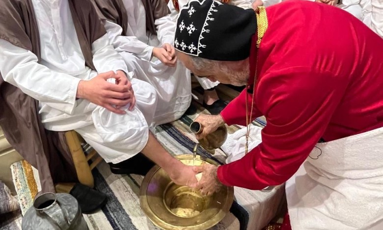 أما مساءً فقد احتفل نيافة المطران سفر برتبة غسل الأرجل في كنيسة السيدة وبعدها في كنيسة مار جرجس يعاونه الآباء الكهنة جورج بحي وملكي كارات حيث غسل أرجل عدد من أبناء الكنيسة على مثال الرب يسوع المسيح.